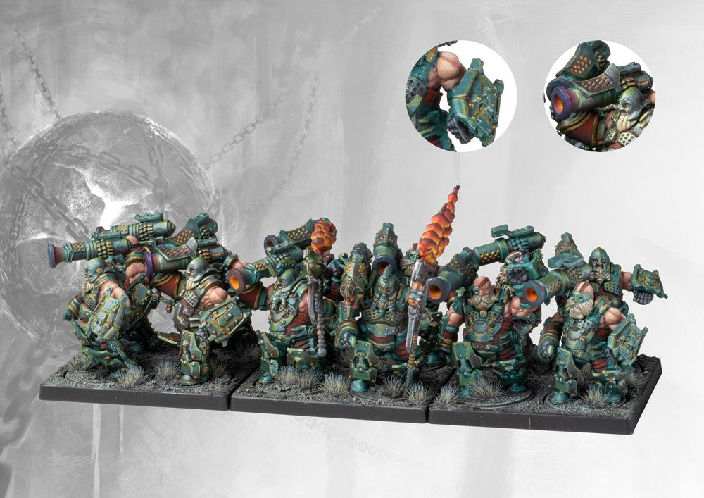 Unlike their Stoneforged brethren, the exoskeleton of the Fireforged is focused simply on the delivery and containment of their main armament: the Blast Cannon. Based on a scaled down design of the Hellbringer Cannons used to hunt the greatest of dragons, the Blast Cannons draw and shape the uncontrolled gift of their Dweghom users to generate powerful directional blasts of superheated flame capable of puncturing even the heaviest of plate at a hundred paces. Their powered exoskeletons enhance their strength, allowing the Fireforged to remain mobile on the field of battle despite the weight of the Blast Cannon to deliver their powerful blasts where most needed. More than capable in close combat, the Fireforged can then follow up a devastating salvo with a savage charge, or easily fend off light units and skirmishers, allowing their heavy weaponry to be employed at bringing down the most heavily armored of foes.