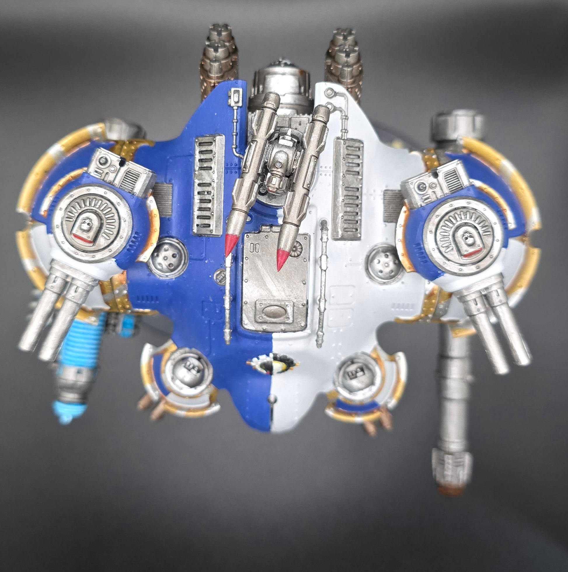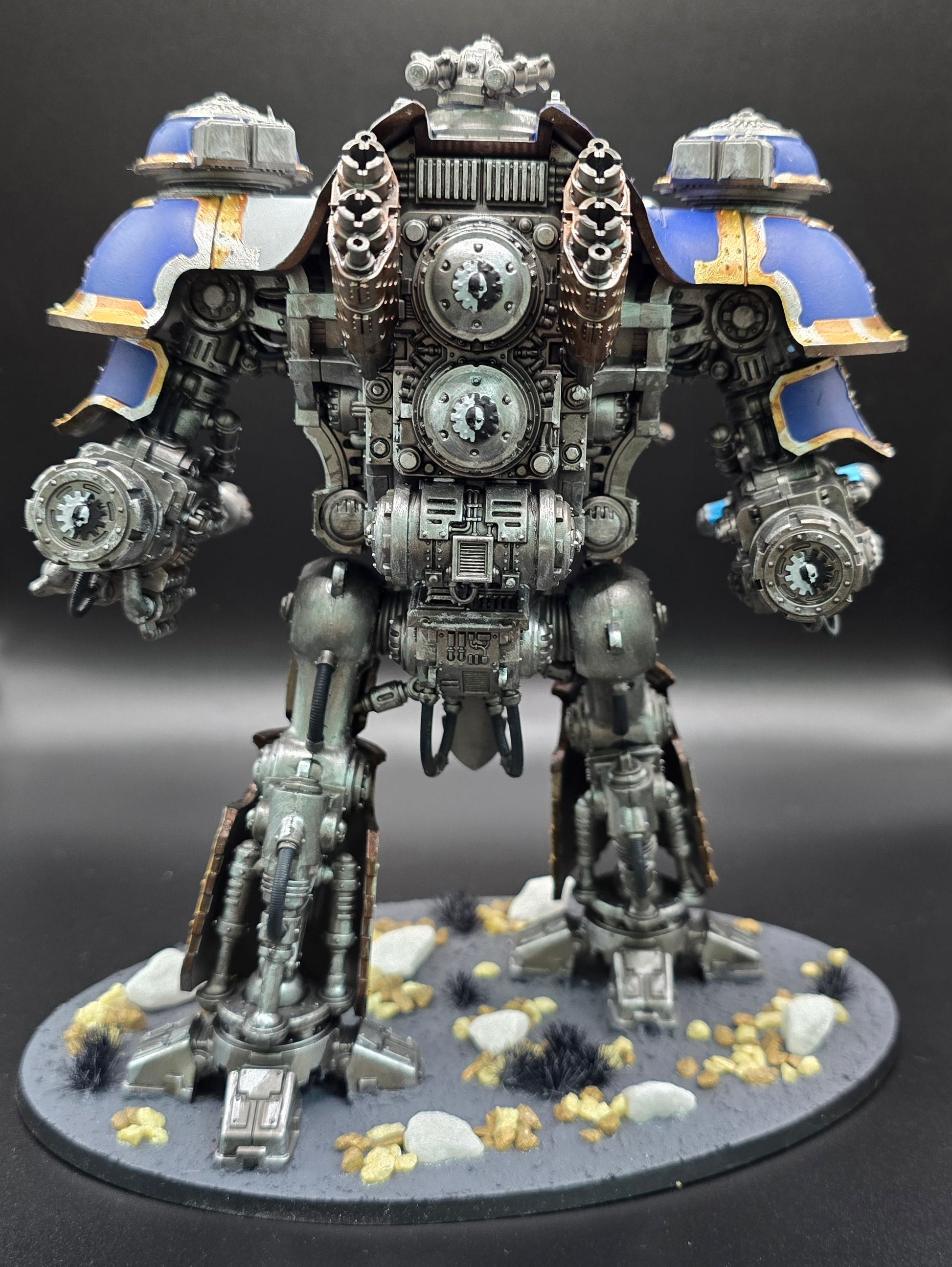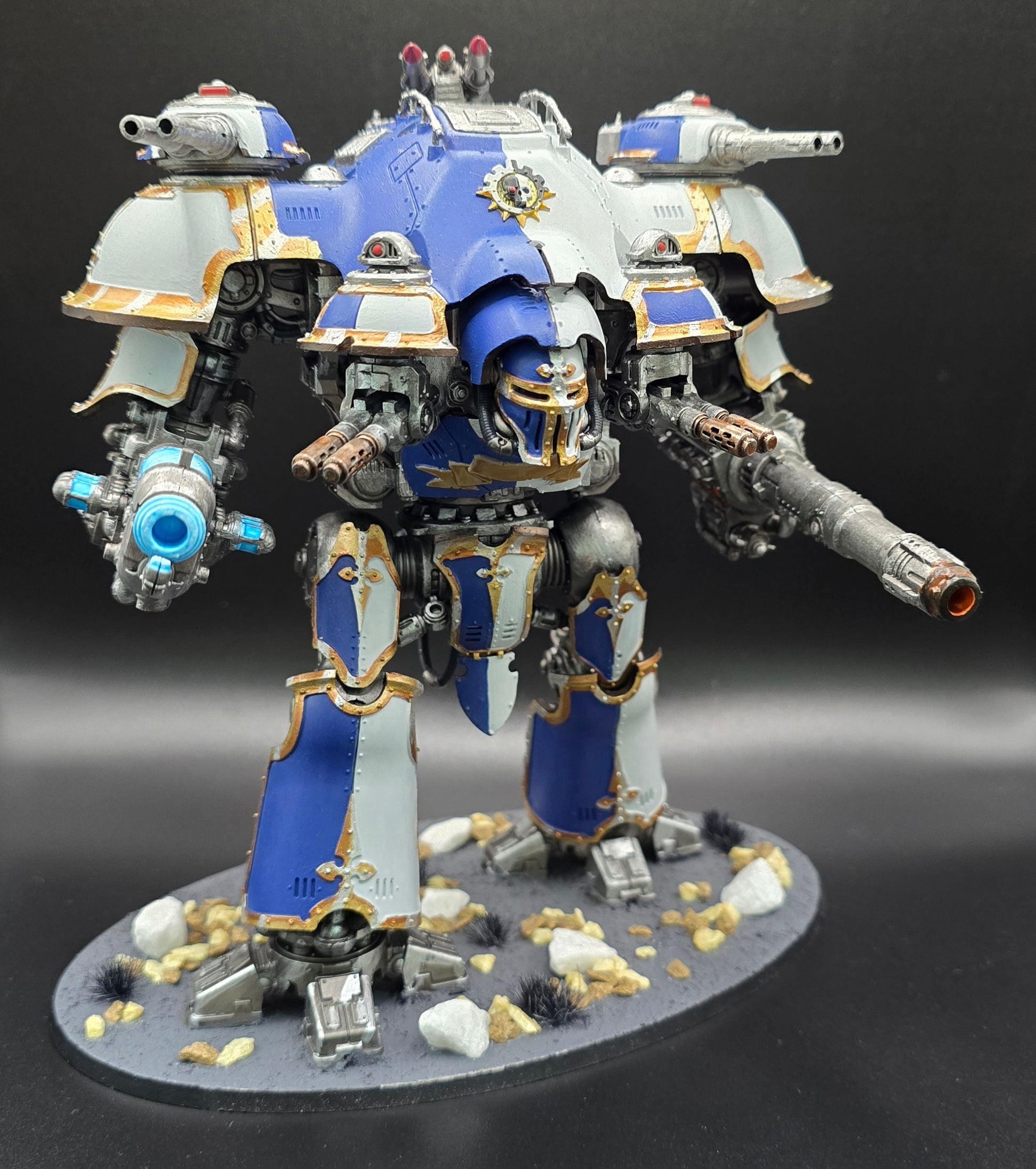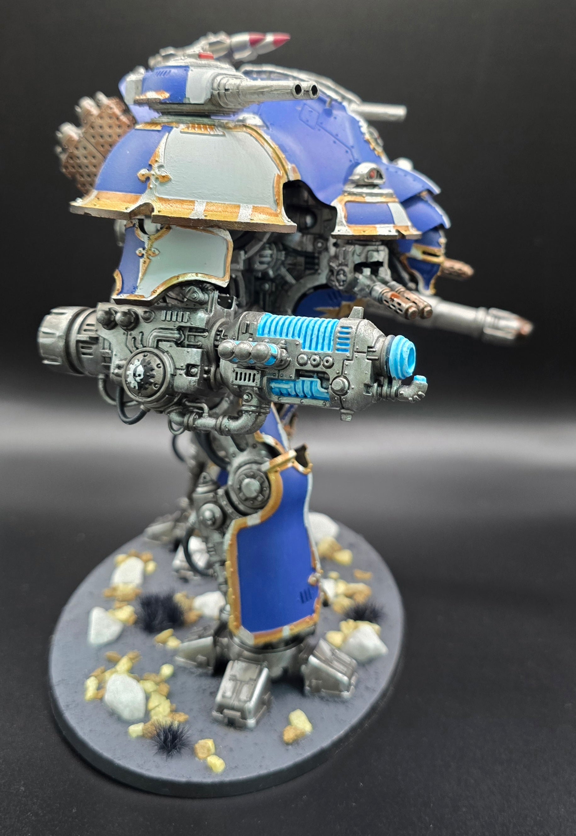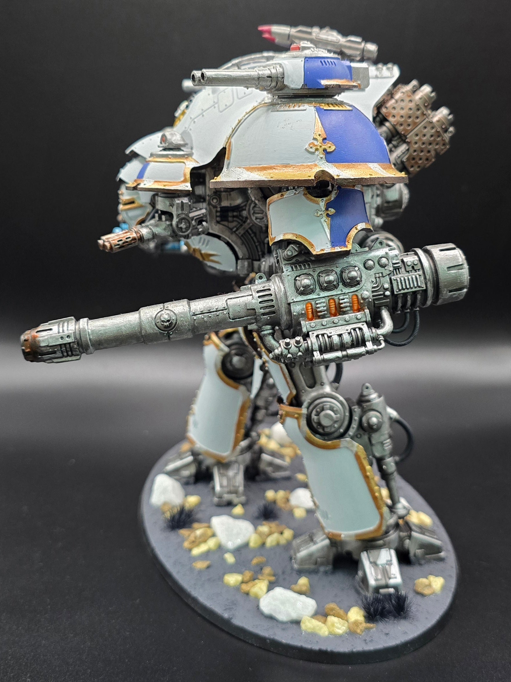 Figura prepintada de un Caballero Castellano, equipado con una Lanza Volcanica, un cañon de plasma Decimador, un Lanzamisiles Rompescudos, dos cañones rompeasedios dobles y dos rifles de fusión dobles.